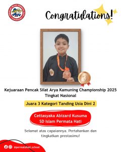 Siswa SD Islam Permata Hati yang mendapatkan Juara 3 kategori Tanding Usia Dini 2 pada Kejuaraan Pencak Silat Arya Kamuning Championship 2025.