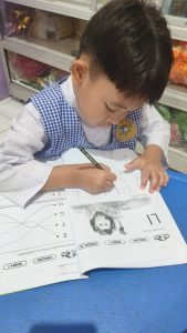Mereka juga berlatih menghubungkan garis serta mencocokkan huruf besar dengan huruf kecil, melatih fokus, motorik halus, dan ketelitian mereka.