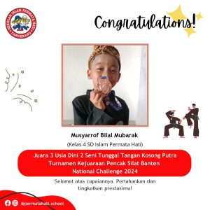 Musyarrof Bilal Mubarok – Juara 3 usia dini 2 seni tunggal tangan kosong putra pada Kejuaraan Pencak Silat Banten National Challenge 2024