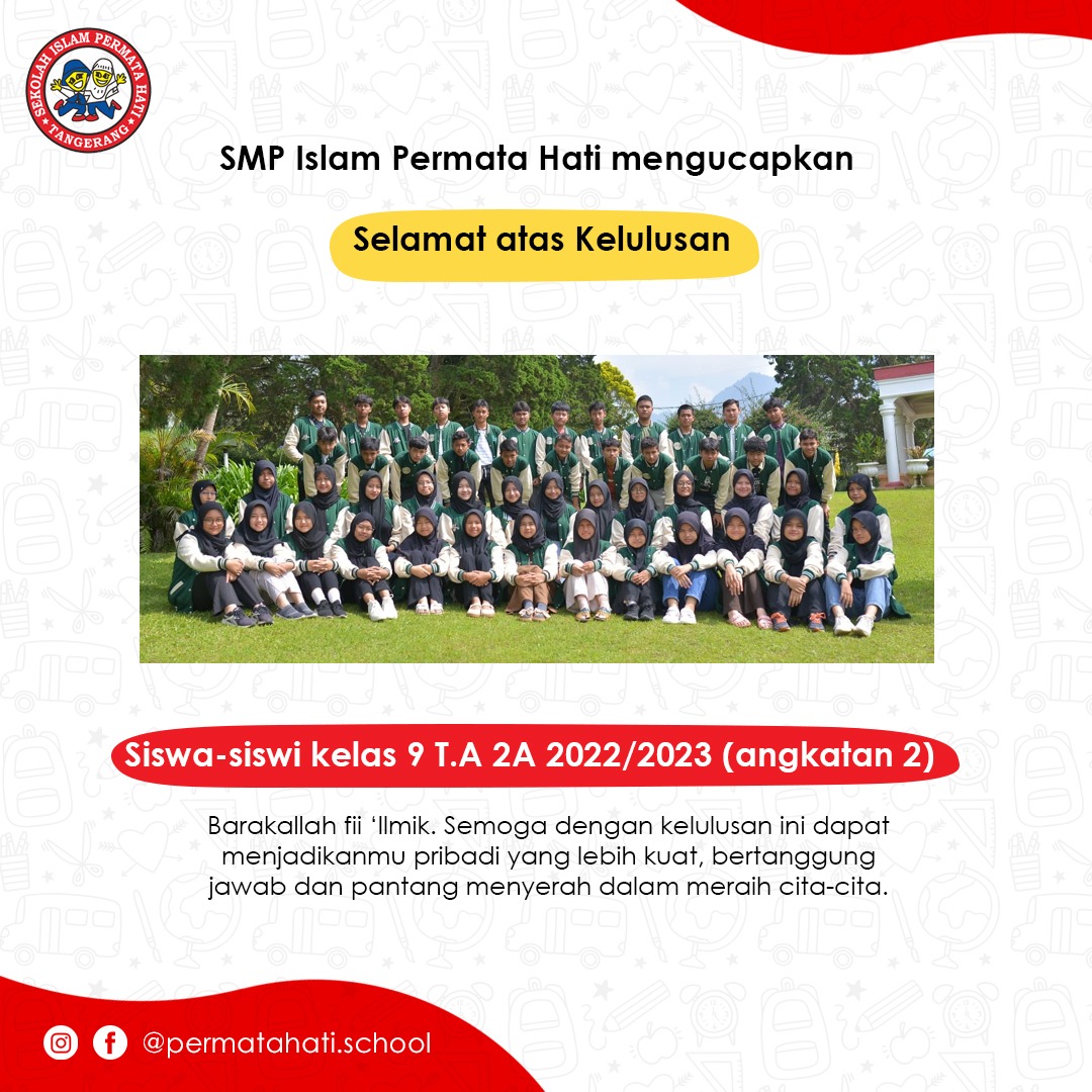 Assalāmu ‘alaikum 😊 SMP Islam Permata Hati mengucapkan “Selamat atas kelulusan siswa-siswi kelas 9 T.A 2022/2023 (angkatan 2)”. Barakallah fii ‘ilmik….