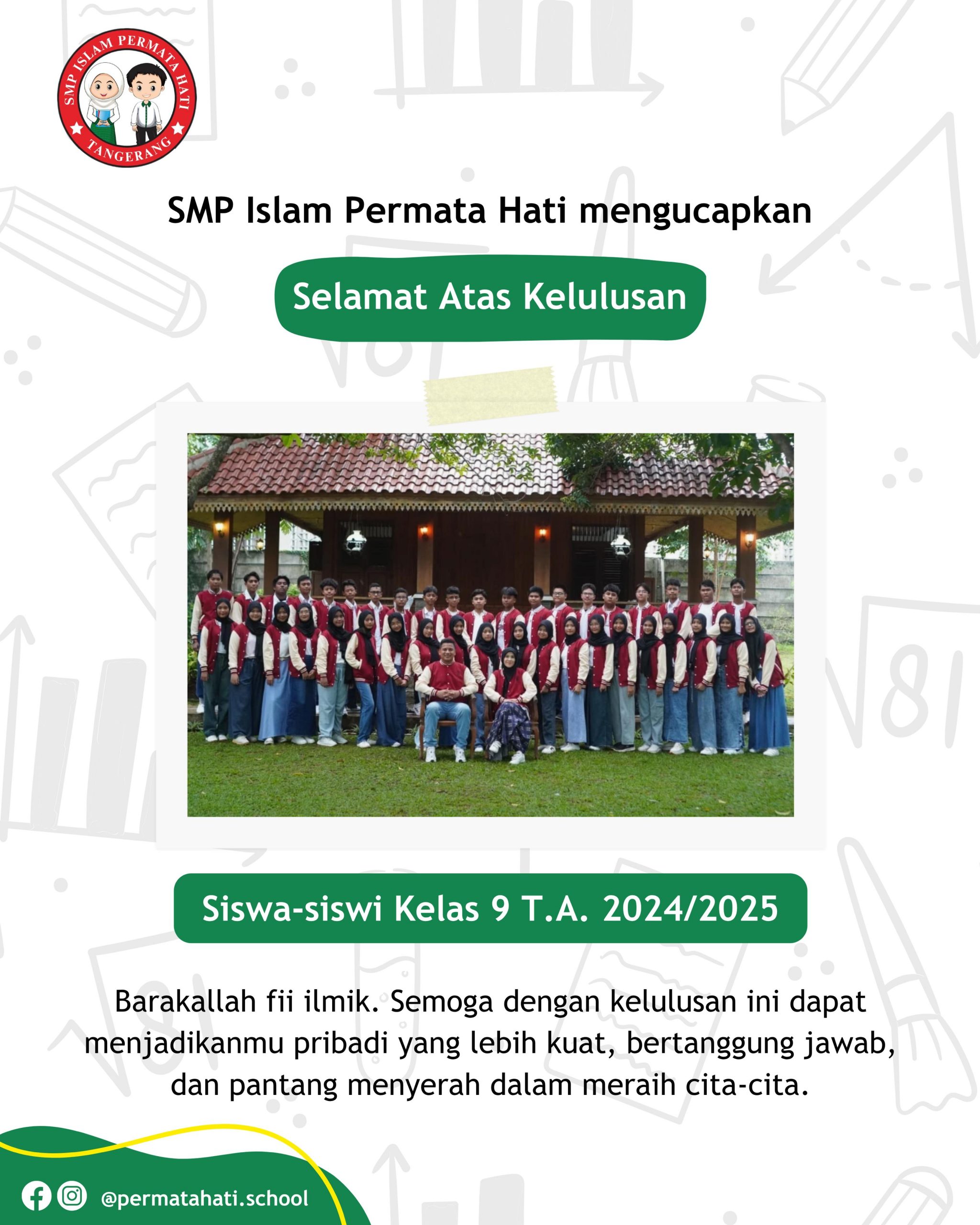 Assalāmu ‘alaikum 😊 SMP Islam Permata Hati mengucapkan “Selamat atas kelulusan siswa-siswi kelas 9 T.A 2024/2025 (angkatan 4)”. Barakallah fii ‘ilmik. Semoga…