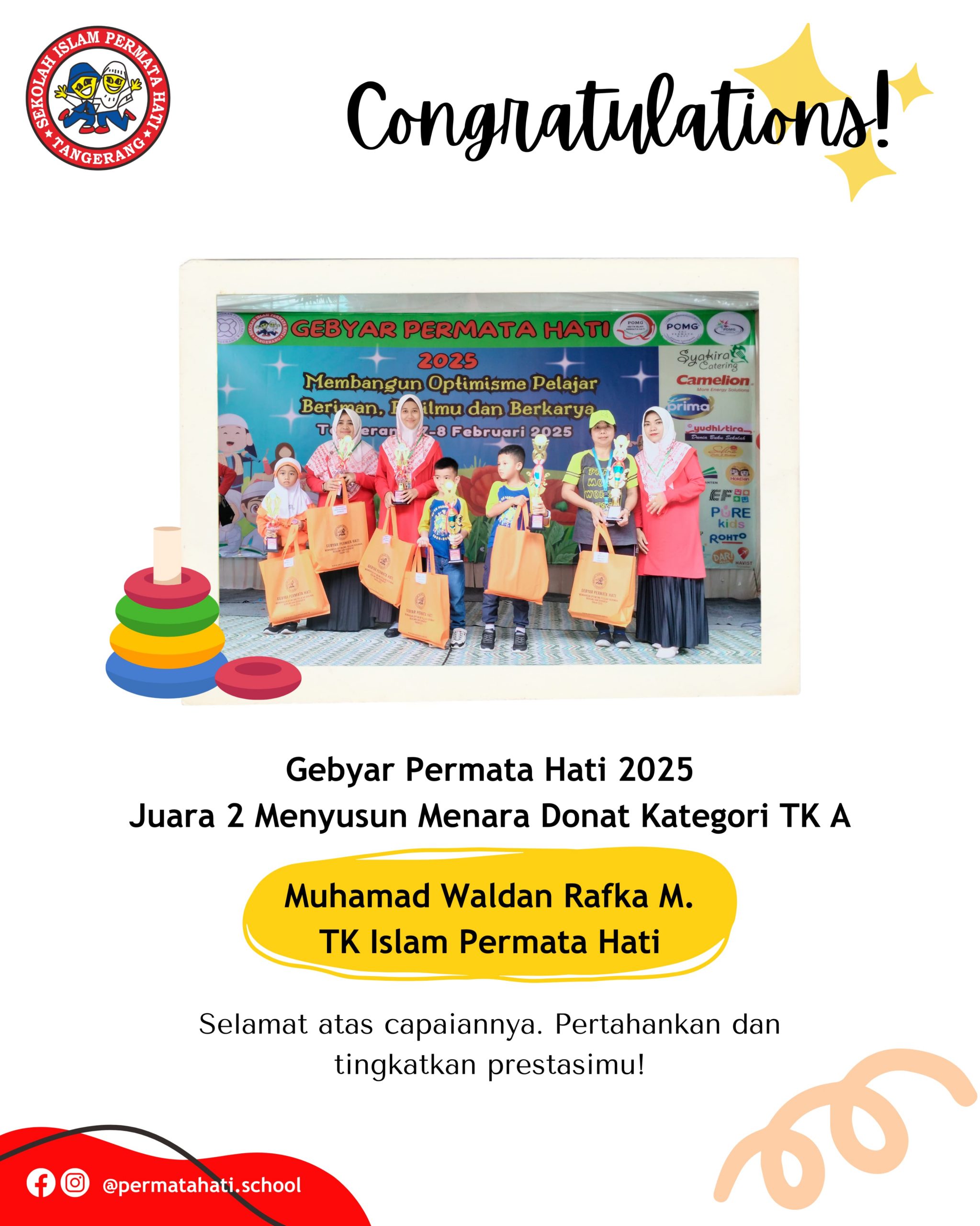Assalāmu ‘alaikum Selamat kepada Muhamad Waldan Rafka Mubarok Siswa TK A Permata Hati yang telah mendapatkan Juara 2 menyusun menara…