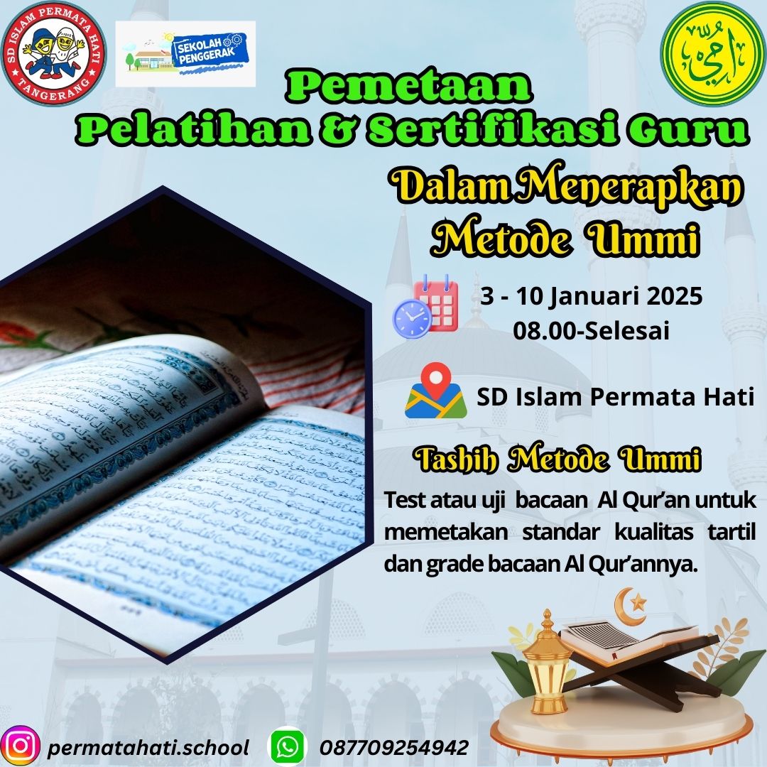 Assalāmu ’alaikum SD Islam Permata Hati akan mengadakan kegiatan pemetaan, pelatihan, dan sertifikasi dalam penerapan metode Ummi pada tanggal 3-10…