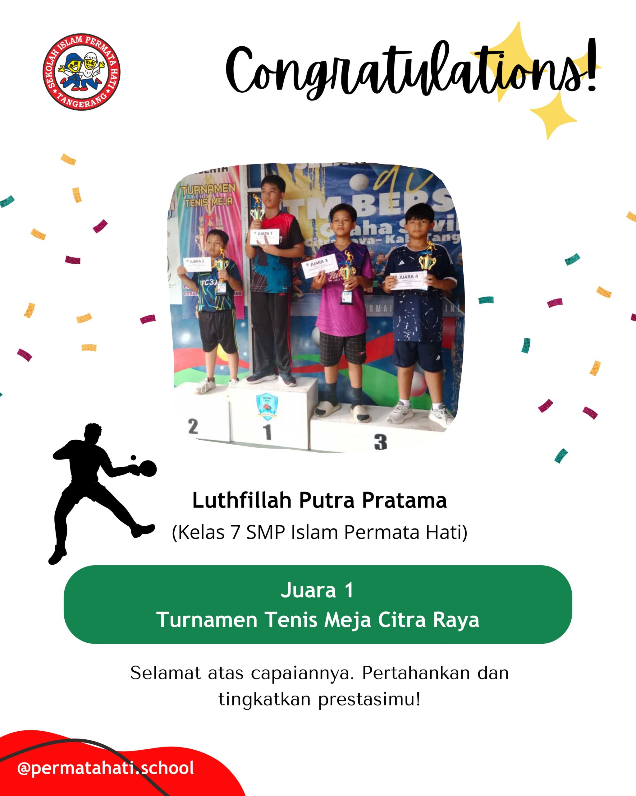 Assalāmu ‘alaikum Selamat kepada Luthfillah Putra Pratama Siswa SMP Islam Permata Hati yang telah mendapatkan Juara 1 tenis meja pada…