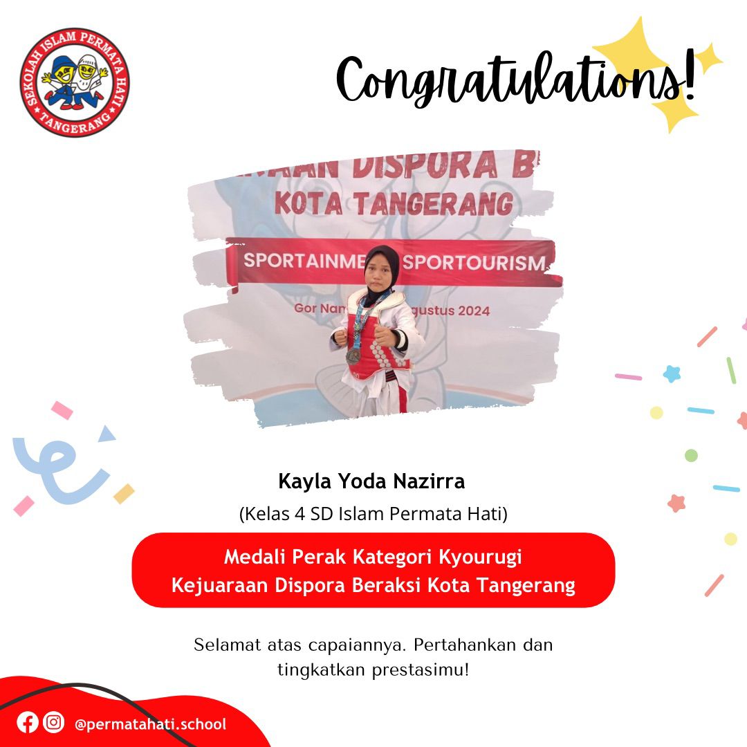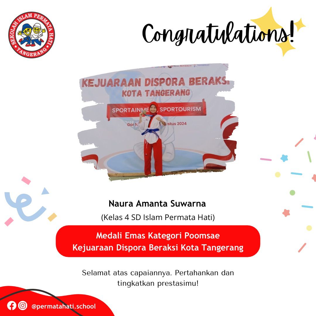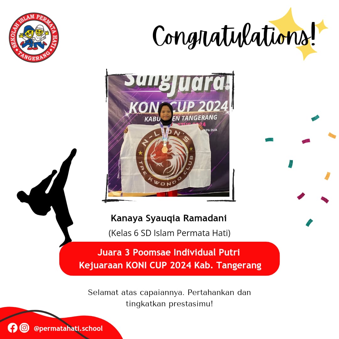 Assalāmu ‘alaikum Selamat kepada Khurun Iiynur Rosyida Siswi kelas 3 SD Islam Permata Hati yang mendapatkan juara 1 kategori Poomsae…