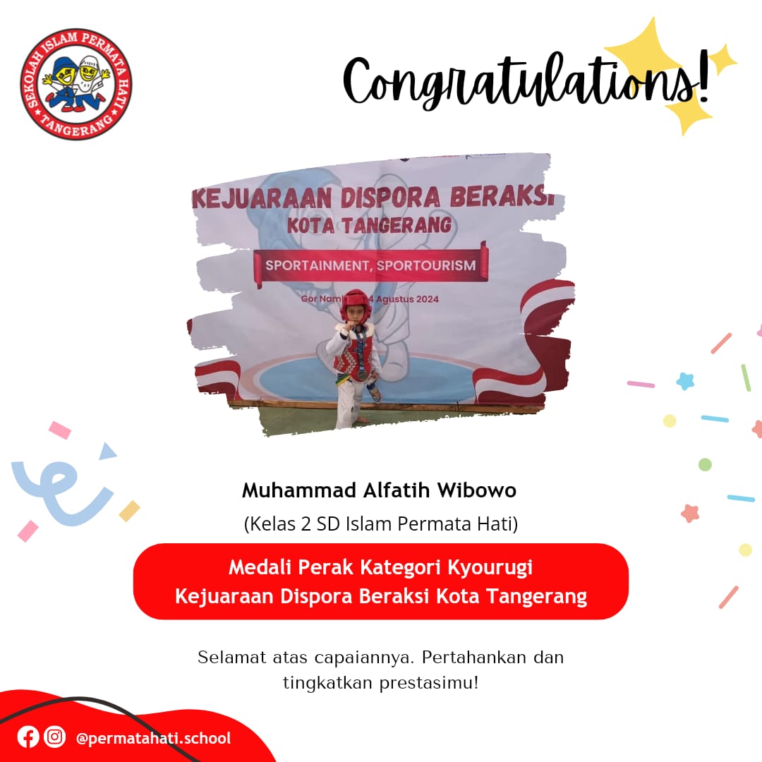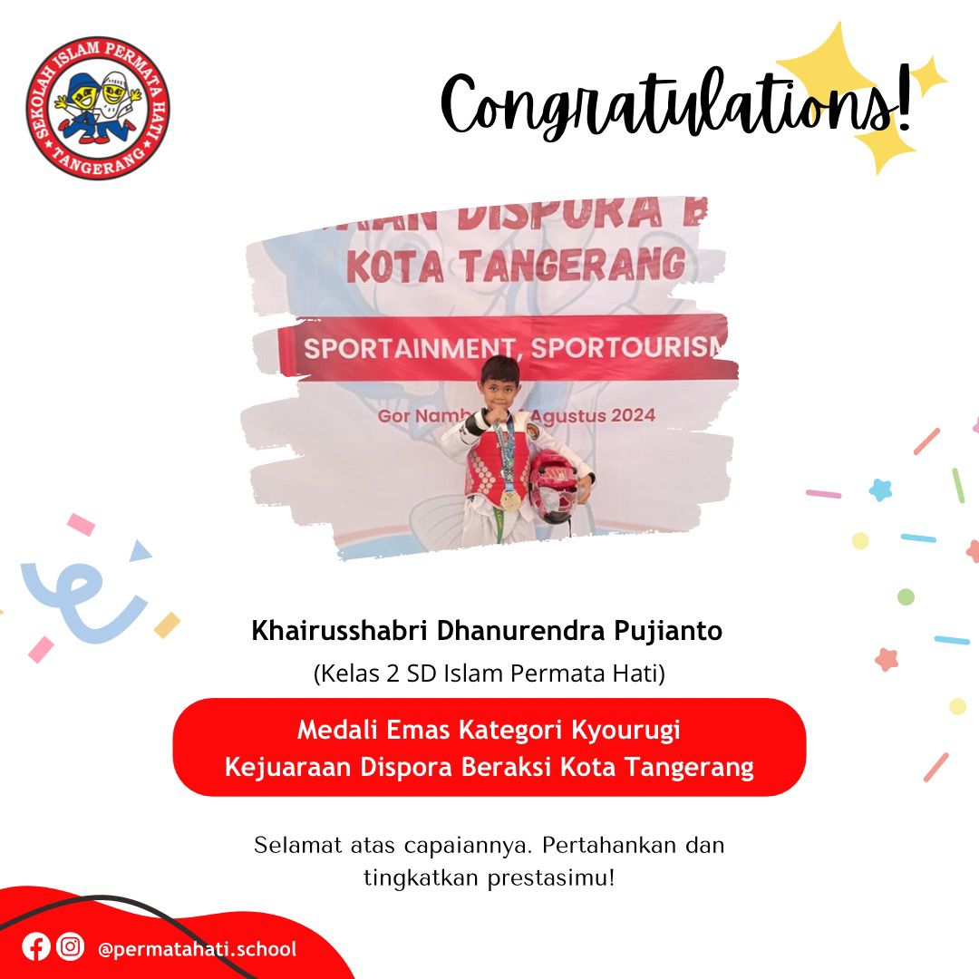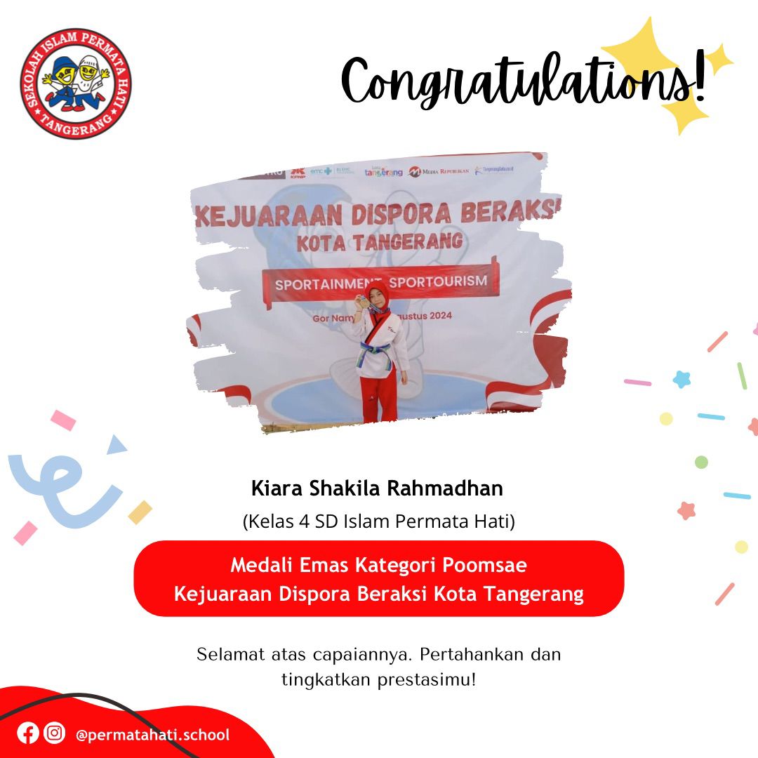 Assalāmu ‘alaikum Selamat kepada Khurun Iiynur Rosyida Siswi kelas 3 SD Islam Permata Hati yang mendapatkan juara 1 kategori Poomsae…