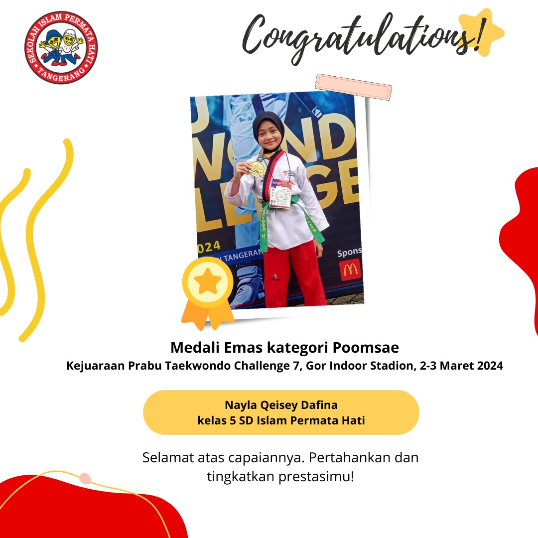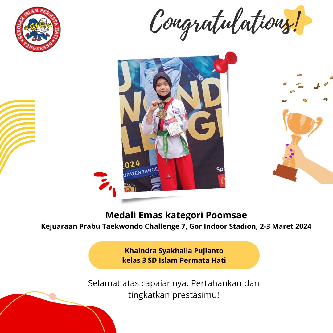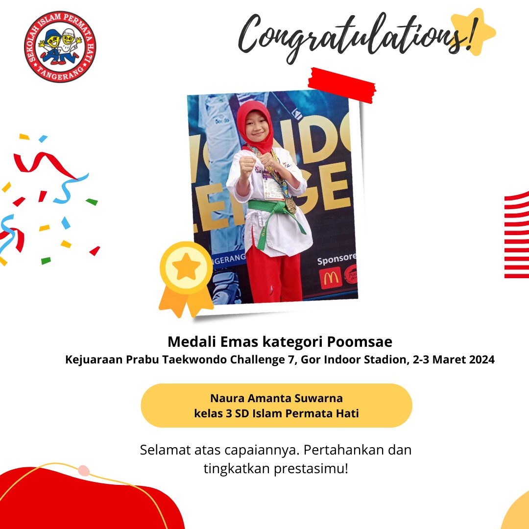Assalāmu ‘alaikum SD Islam Permata Hati mengucapkan selamat kepada Khaindra Syakhaila Pujianto Yang telah mendapatkan medali emas kategori Poomsae pada…
