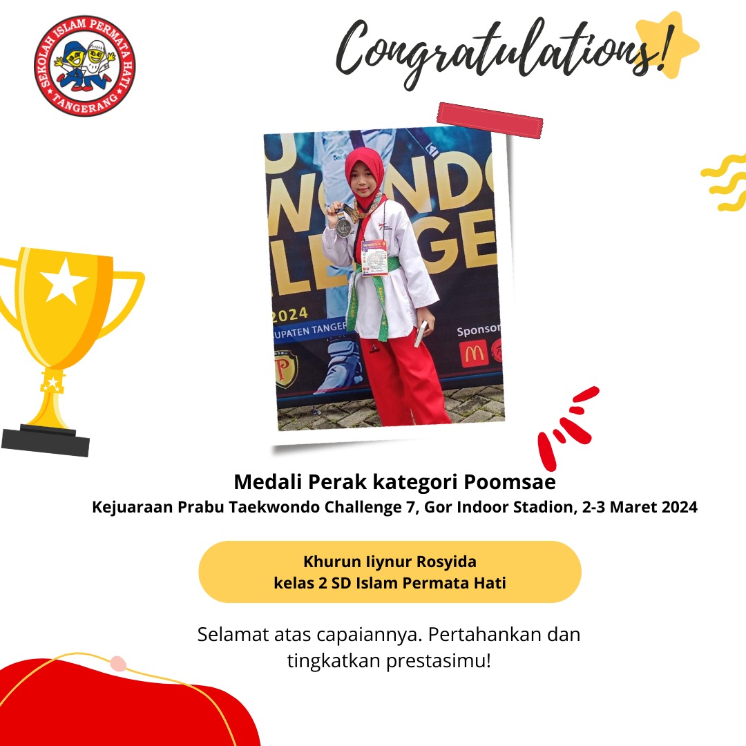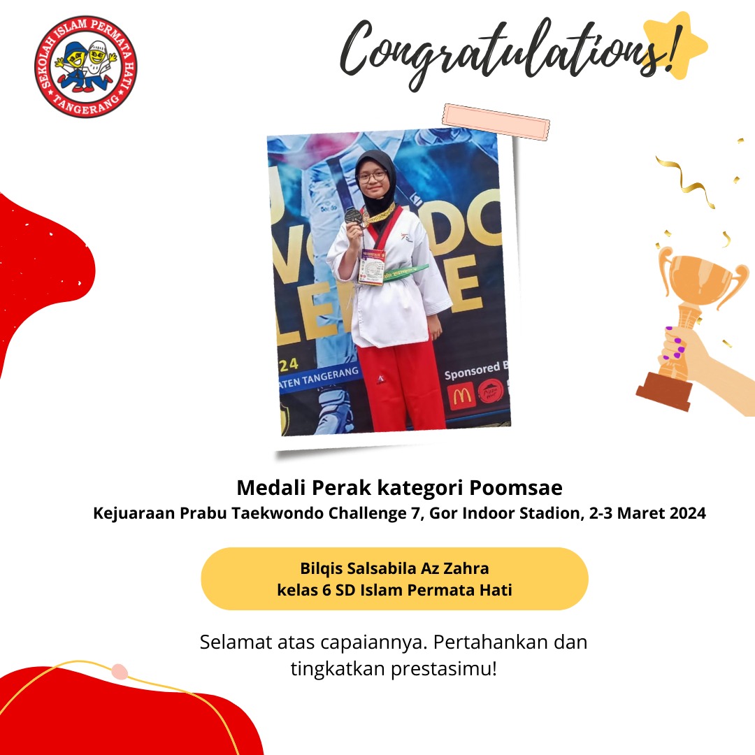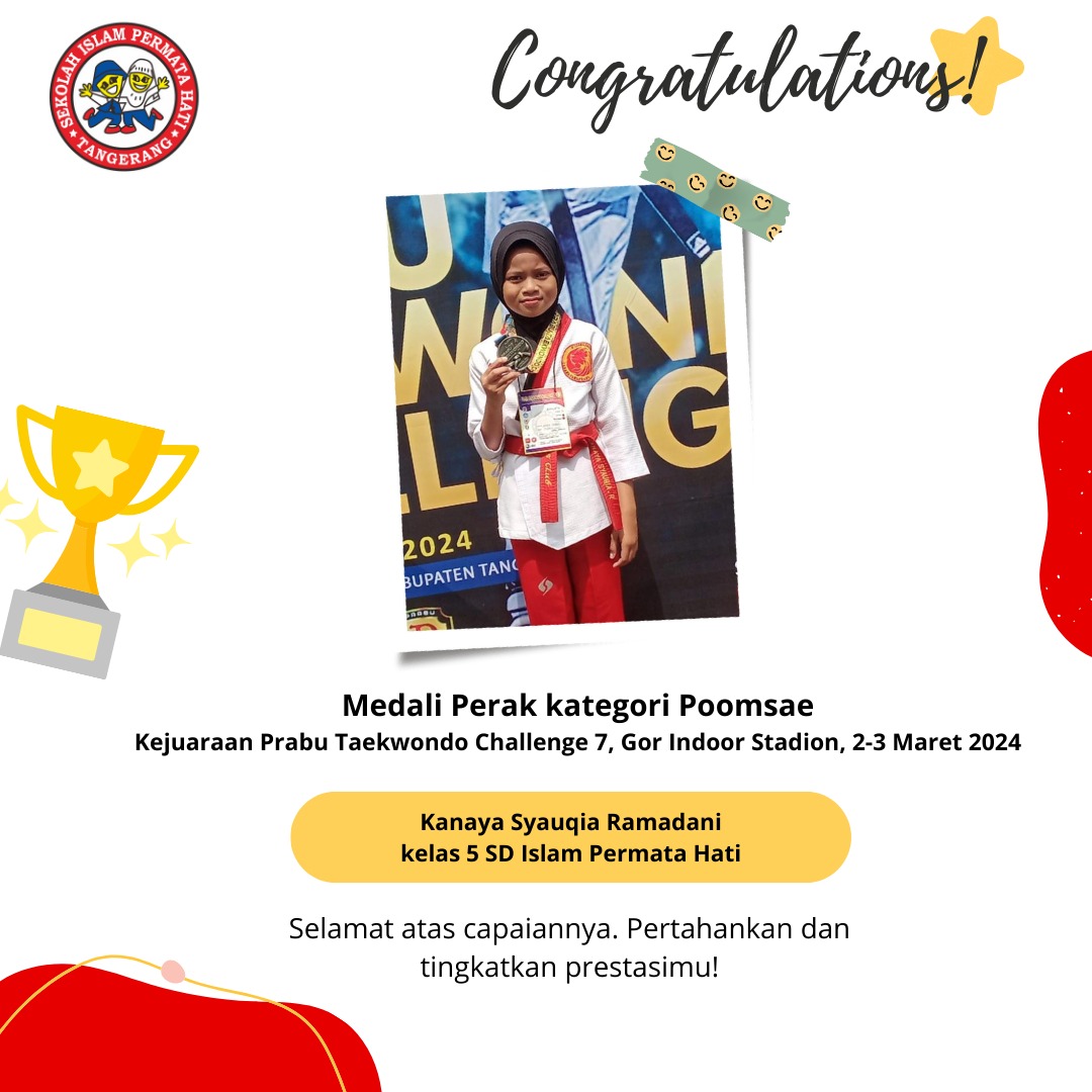 Assalāmu ‘alaikum SD Islam Permata Hati mengucapkan selamat kepada Kanaya Syauqia Ramadani Yang telah mendapatkan medali perak kategori Poomsae pada…