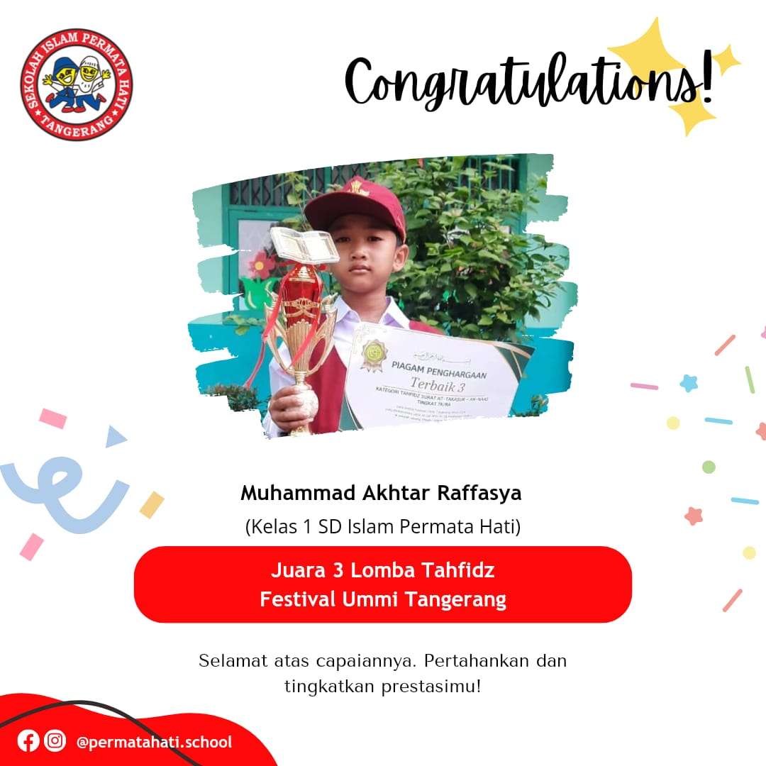 Assalāmu ‘alaikum Selamat kepada Muhammad Akhtar Raffasya, siswa kelas 1 SD Islam Permata Hati yang telah menjadi Juara 3 lomba…