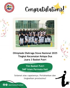 Siswi SMP Islam Permata Hati yang telah mendapatkan Juara 3 Basket Putri pada Olimpiade Olahraga Siswa Nasional (O2SN) tingkat Kec. Kelapa Dua 2025, pada 17 April 2025.